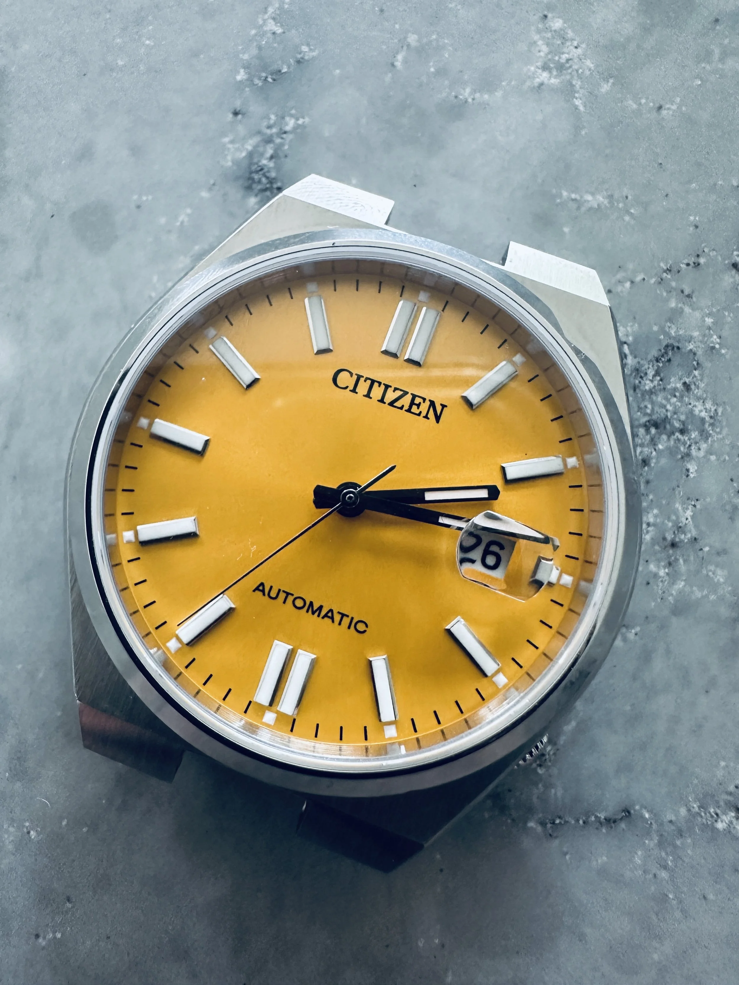 Under the hood, the Tsuyosa uses Citizen’s automatic Miyota 8210 movement. Solid, dependable, nothing fancy — but it gets the job done and has a display caseback so you can admire the mechanics while pretending you understand them.