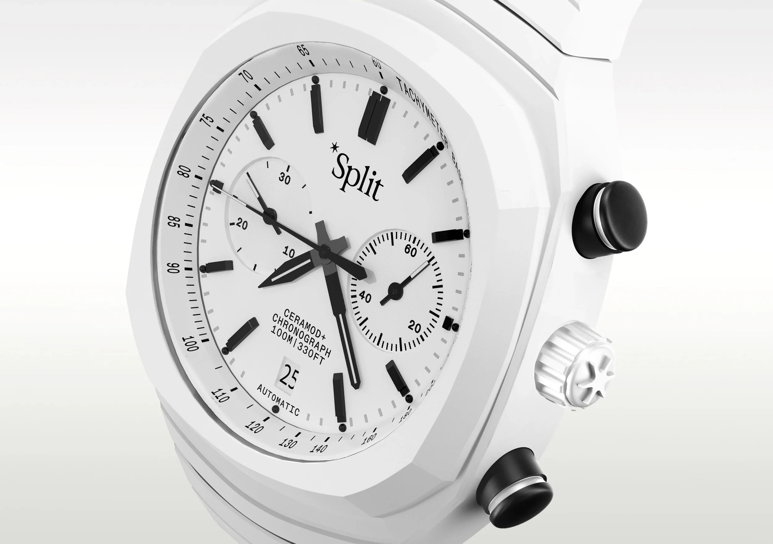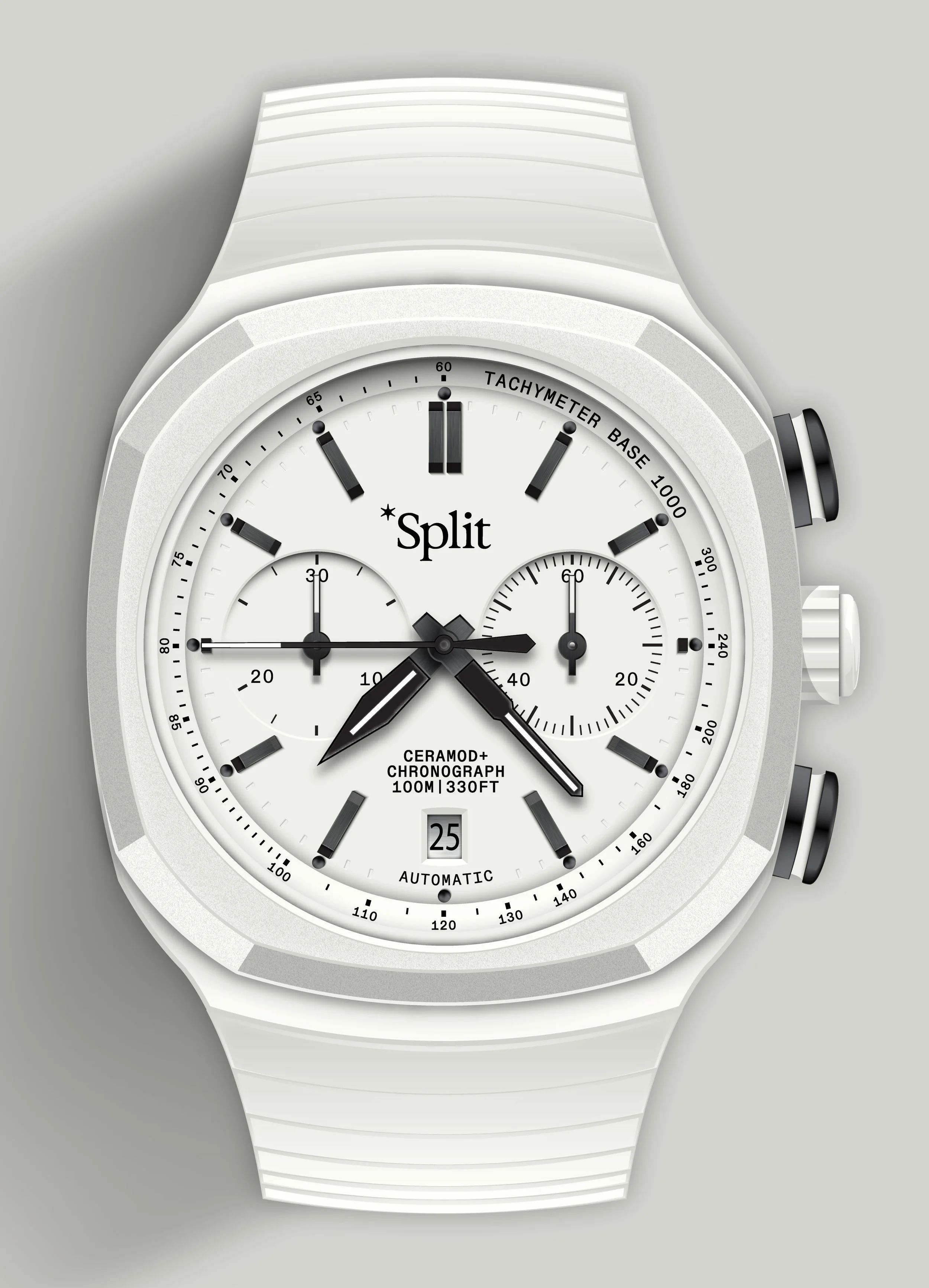 Inside sits a bi compax automatic chronograph movement from the Seiko family, bringing proven reliability to a watch that already pushes boundaries elsewhere. The case is made from Split’s signature Ceramod plus material, giving it a tough, modern feel while keeping it comfortable on the wrist. It is paired with an FKM strap that feels as robust as it does wearable.