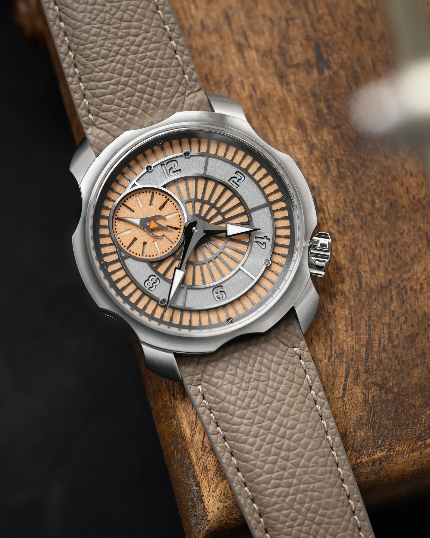 Inside is a modified Chronode P.1003 automatic, running at 4Hz (28,800vph) with a 60-hour power reserve. The display is hours, minutes, and small seconds, with that seconds register pushed to 10 o’clock to match the dial architecture.