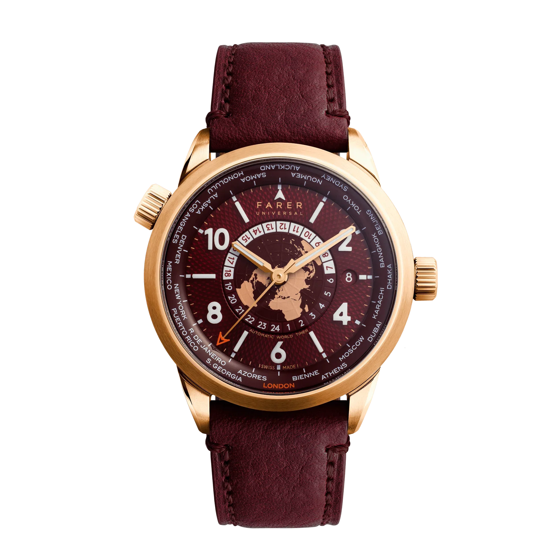Farer describes the World Timer as “the ultimate travel companion”, designed to show 24 key cities in a single glance. The set up is straightforward.
