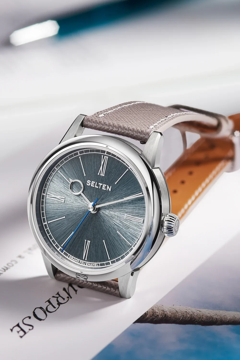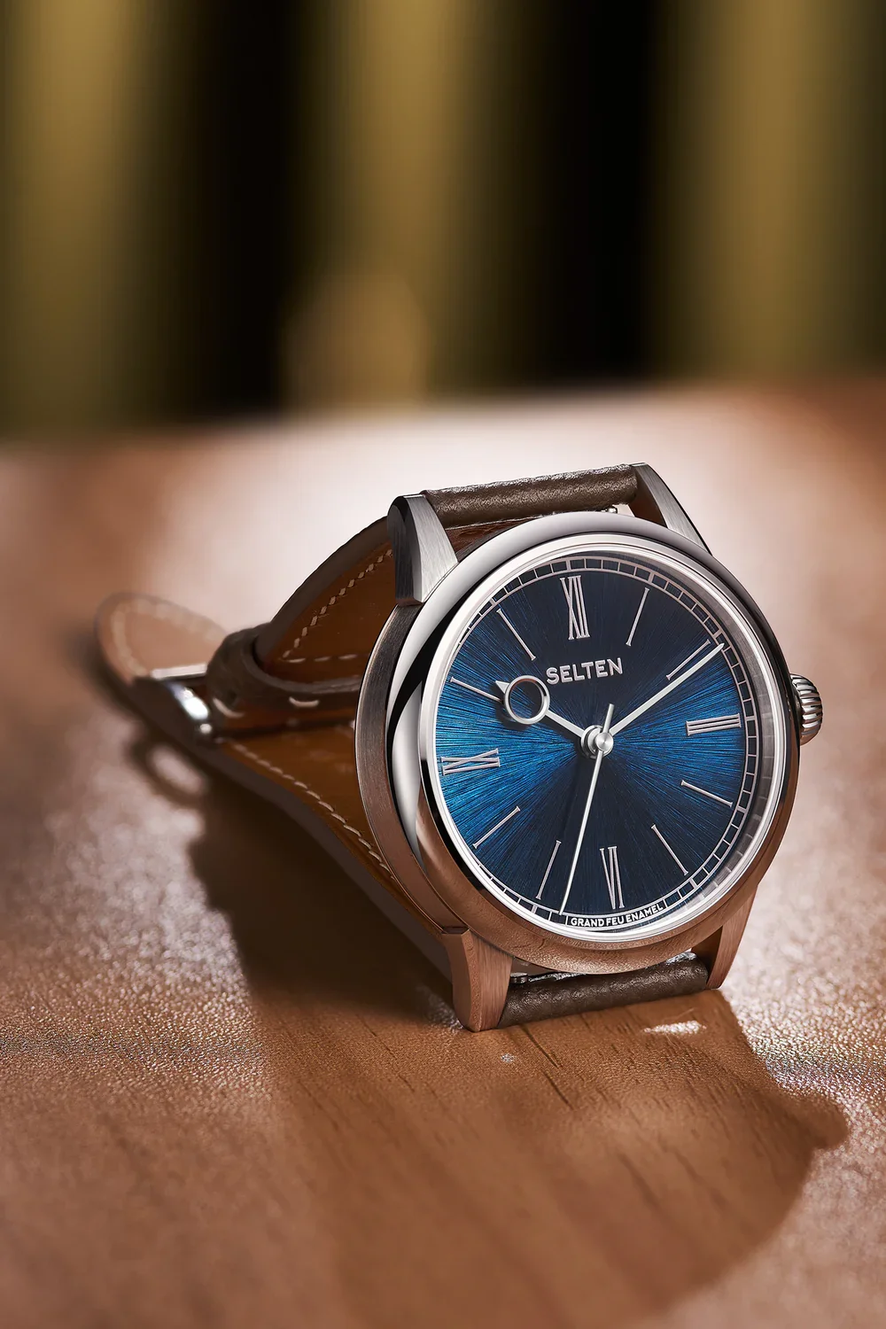 Let’s start where Selten clearly wants your attention. The dial. Each Grand Feu enamel dial begins life as a silver base that is carefully engraved by hand with hundreds of fine grooves, either in a radiating flare pattern or a hypnotic spiral. Enamel is then applied in layers and fired repeatedly at extremely high temperatures until it achieves that unmistakable glass like depth that only true Grand Feu enamel can deliver.