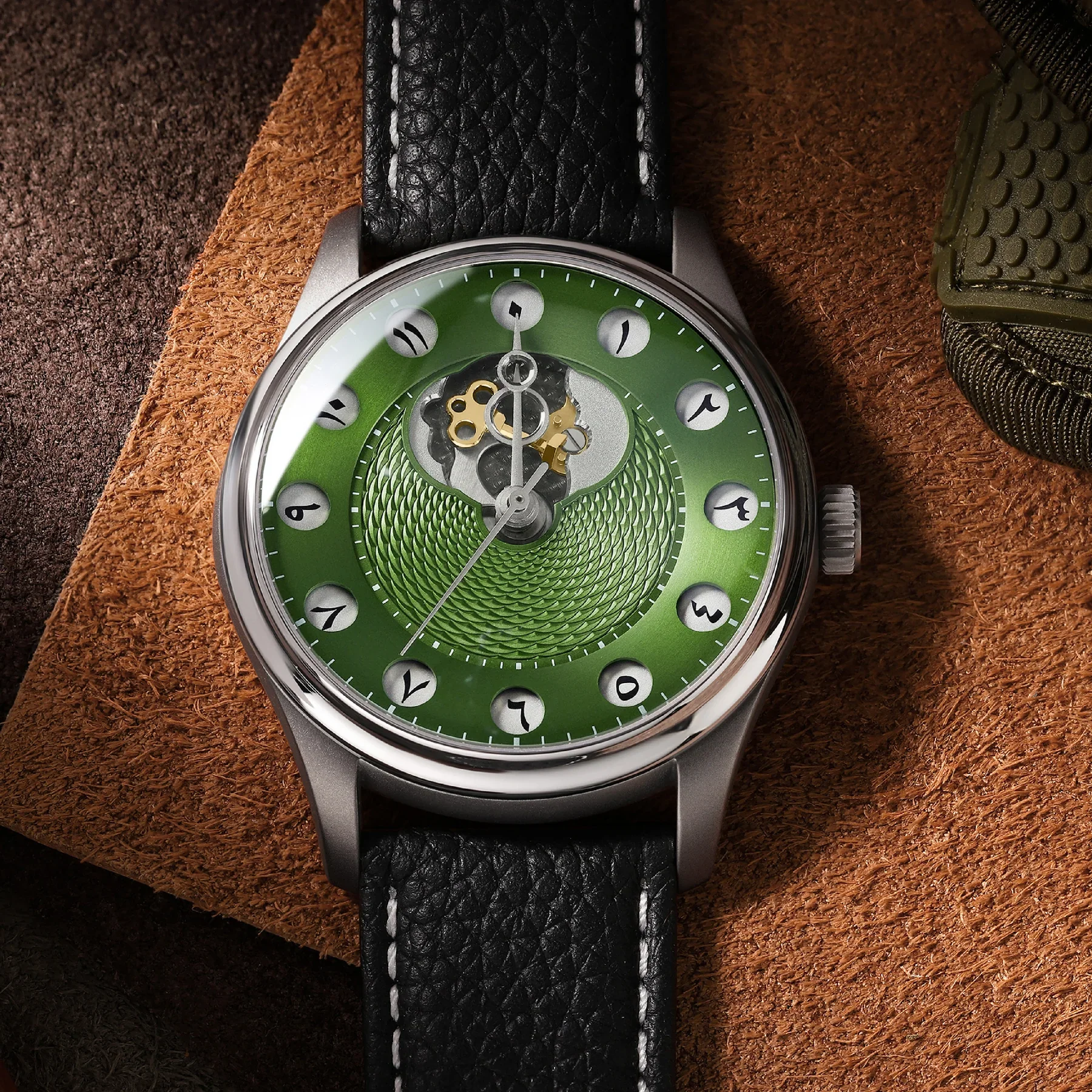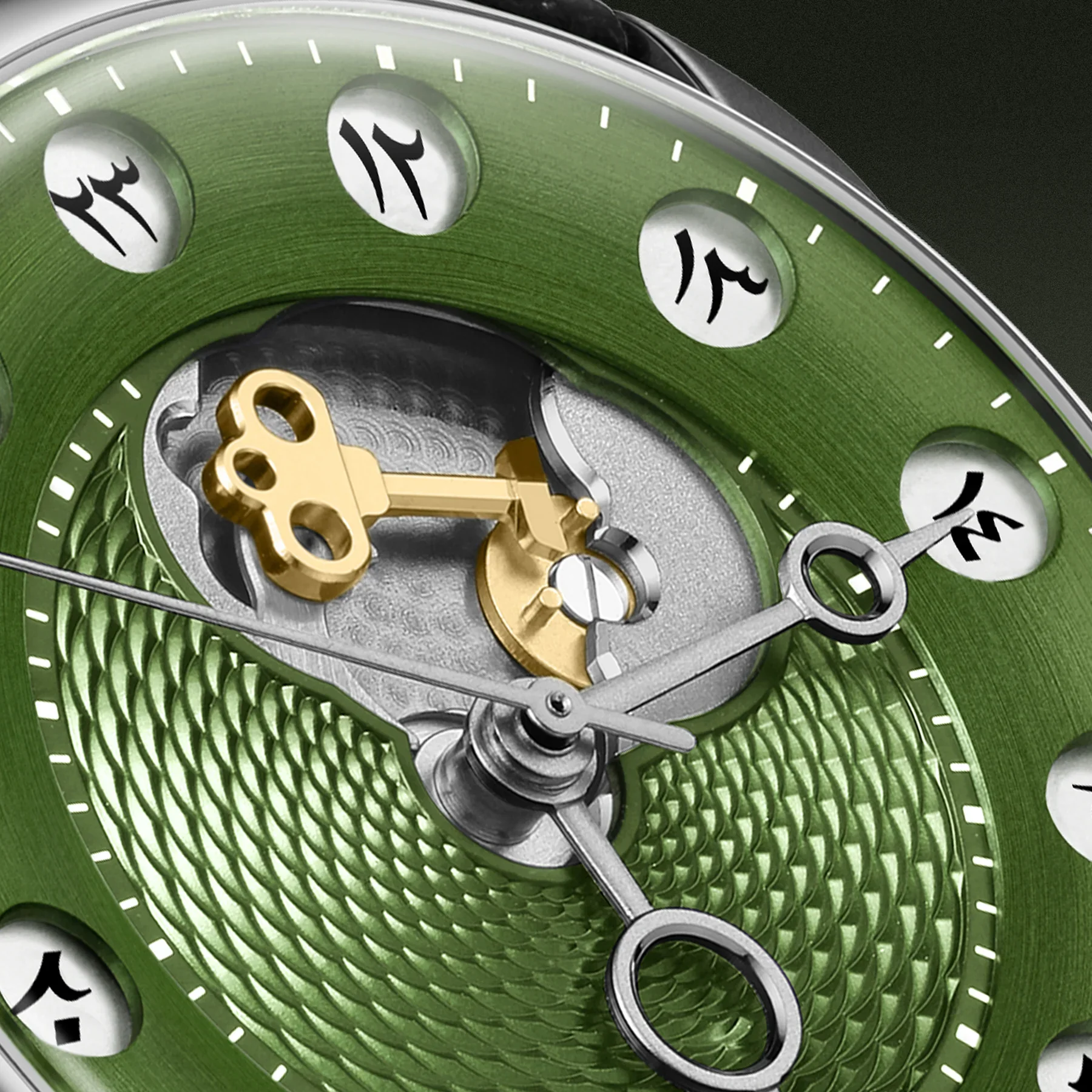 The olive green dial adds warmth and depth, giving the watch a richer presence on the wrist while remaining effortlessly wearable. Paired with the upgraded finishing options, exhibition caseback and an engine-turned guilloché custom rotor, it feels like the complete expression of what OLTO 8 set out to achieve with this model. Alongside all this customisation are Arabic numerals and a beautifully finished dial that allows the gold finished key mechanism to stand out in a subtle but elegant way.