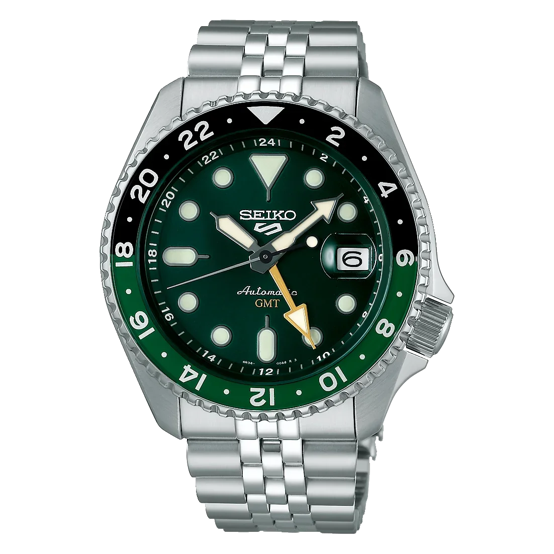 Buy now - https://www.seikoboutique.co.uk/product/seiko-5-sports-skx-gmt-bi-colour-green-ssk035k1/