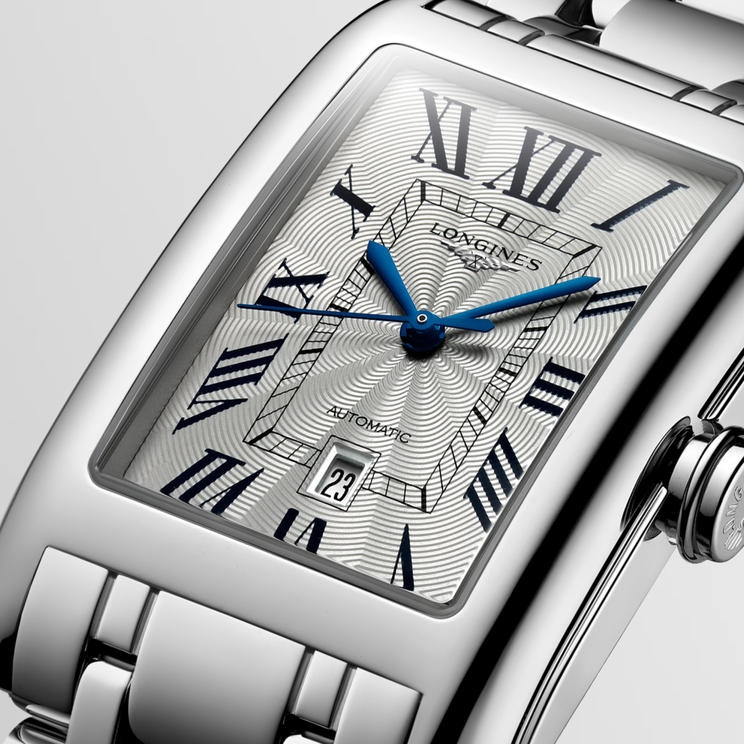 The DolceVita is a departure from the usual round cases. Measuring 27.7 × 43.8 mm, this rectangular automatic watch channels the elegance of early 20th-century design.