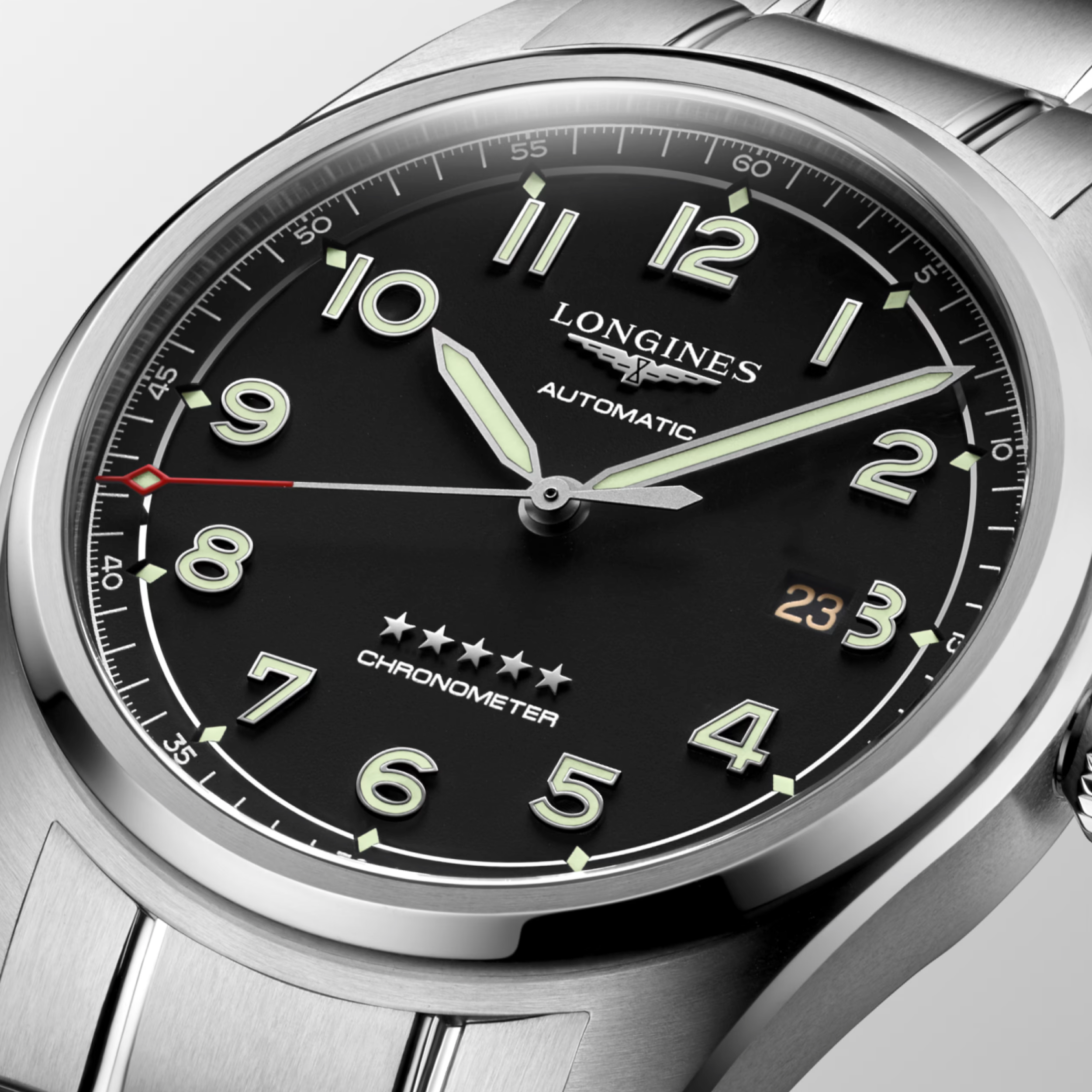 It offers 100 m of water resistance and features a matte black dial with large Arabic numerals, luminous markers, and a strong pilot-watch presence. The Spirit is a versatile, everyday watch — sporty, precise, and full of character.