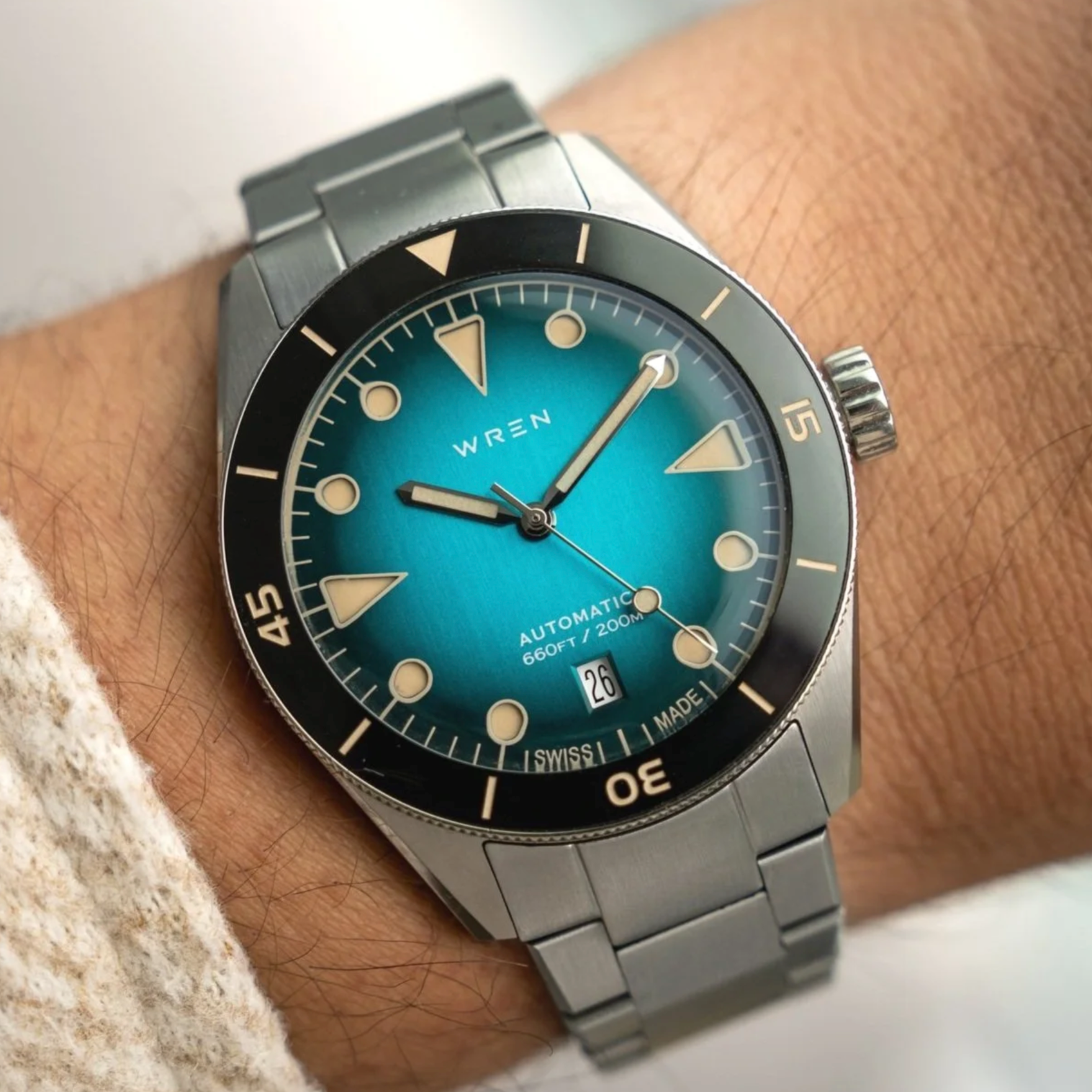 Proof that you don’t need to remortgage your house to wear a turquoise dial. The Wren Diver One Aqua is an affordable yet punchy choice, proudly British and refreshingly simple. At 40 mm, it’s versatile enough to wear every day, and the bold turquoise dial gives it bags of personality. Think of it as the underdog of the list — the indie band you loved before everyone else caught on.