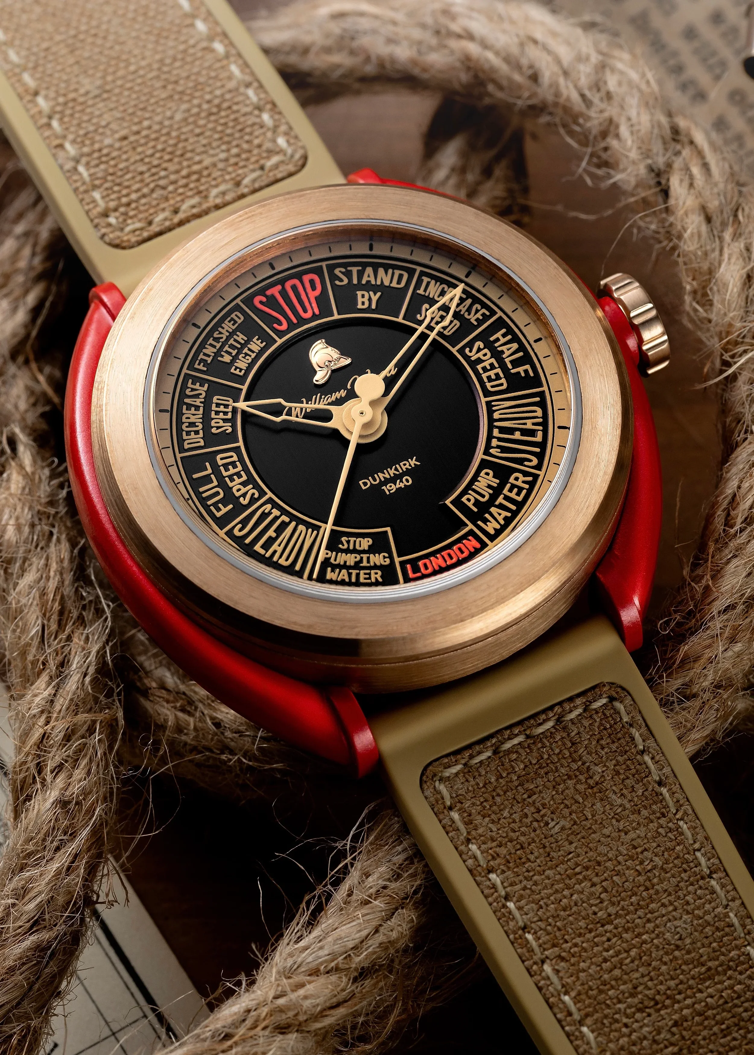 William Wood frames the Dunkirk Watch as a Swiss-made bronze nautical watch created in collaboration with the London Fire Brigade fireboat, the Massey Shaw, which the brand says saved over 600 lives off the beaches of Dunkirk during World War II.