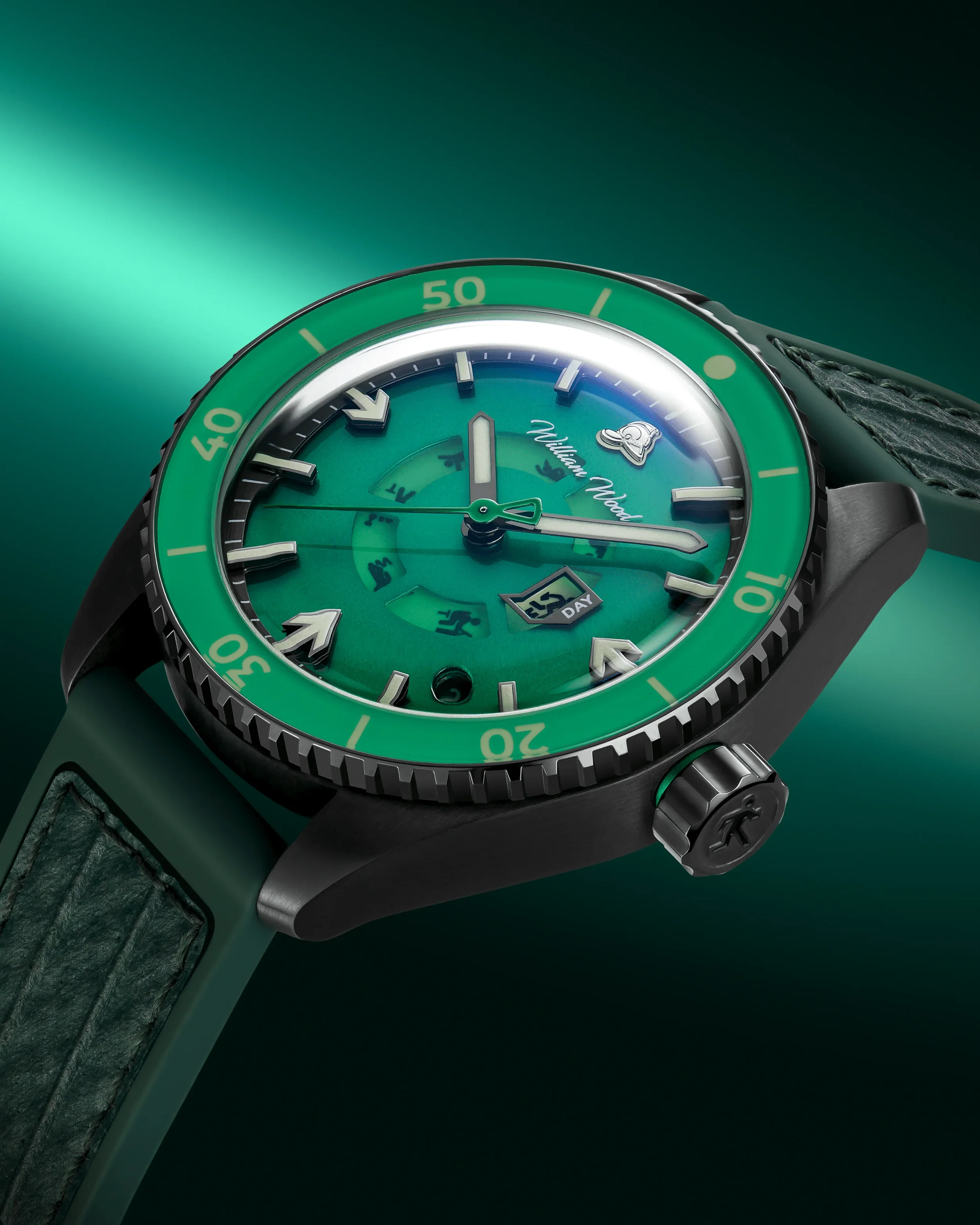 William Wood describes it as a stainless-steel gunmetal day-date watch inspired by the fire exit sign, with a Swiss Sellita SW220 movement that animates the “running man” across seven different day-of-week actions.