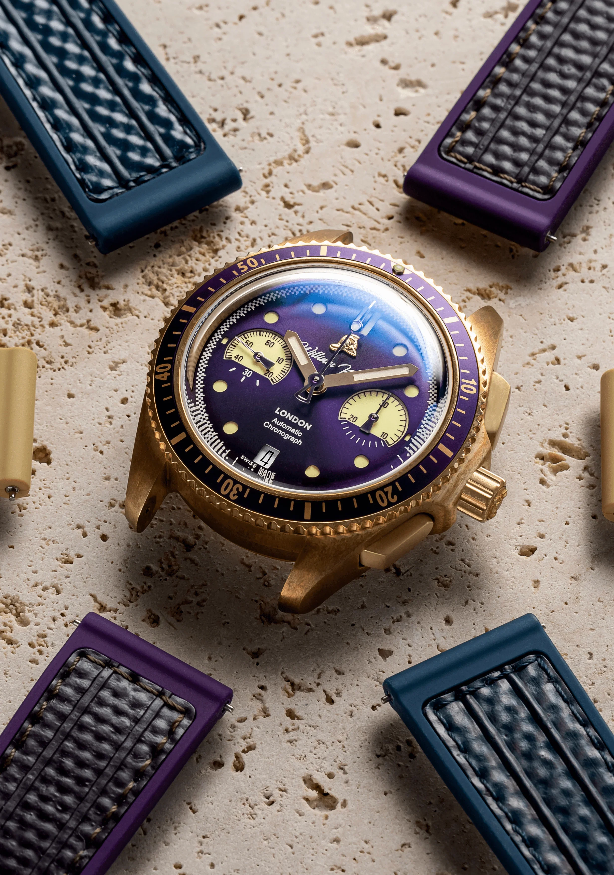 William Wood isn’t shy about materials. Their watches incorporate elements tied directly to firefighting history, most famously brass sourced from vintage British firefighter helmets, melted down and integrated into components. These are often called out in the crown and/or caseback details, depending on the collection and serve as a constant tribute to the cause.